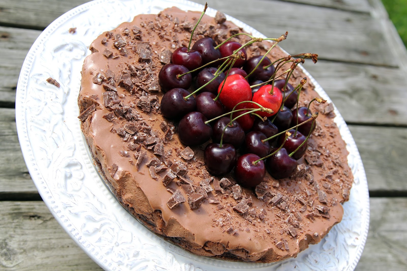 Siin on üks vägagi šokolaadine kook, kus mahlast põhja katab tumedast šokolaadist tehtud täidis, millele annab erilise maitsenüansi konjak ( selle asemel võib kasutada ka viskit vms). Kaunistamiseks kasutasin mureleid, mis sobivad imehästi sellesse šokolaadisesse torti värskust andma.